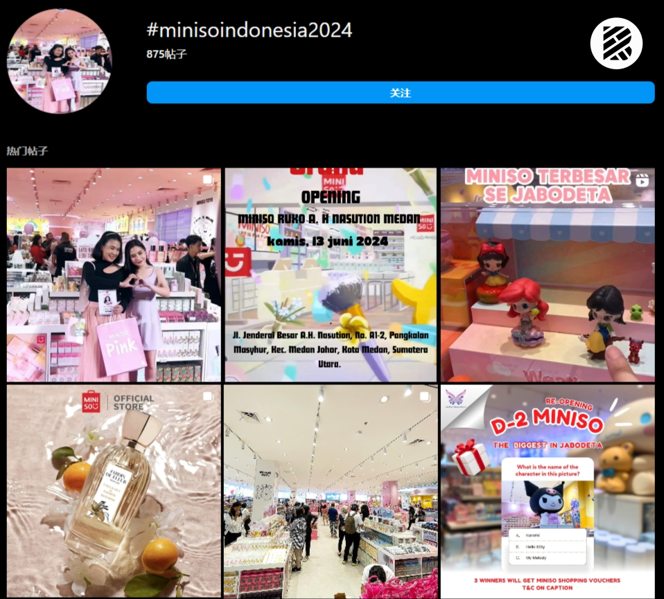名创优品在印尼市场充分利用了Instagram、Facebook等社交媒体平台与消费者进行高频互动。举个例子,名创优品的Instagram内容具有鲜明的特色,统一的色调和精心设计的图片营造出一种舒适愉悦的视觉体验,给人留下深刻印象,并且使用印尼本地语言,增强了品牌的亲和力和本土化形象。每当新品发布或新联名产品推出时,名创优品都会在Instagram上举办抽奖活动,鼓励粉丝参与并分享活动信息。抽奖活动的内容都能获得数十万甚至上百万次的播放量,互动量也常常达到数万次。名创优品积极鼓励印尼消费者到店打卡并在分享到Facebook、Instagram、TikTok等社交媒体上,这促使每周都有数百条UGC添加到印尼名创优品的词条中。