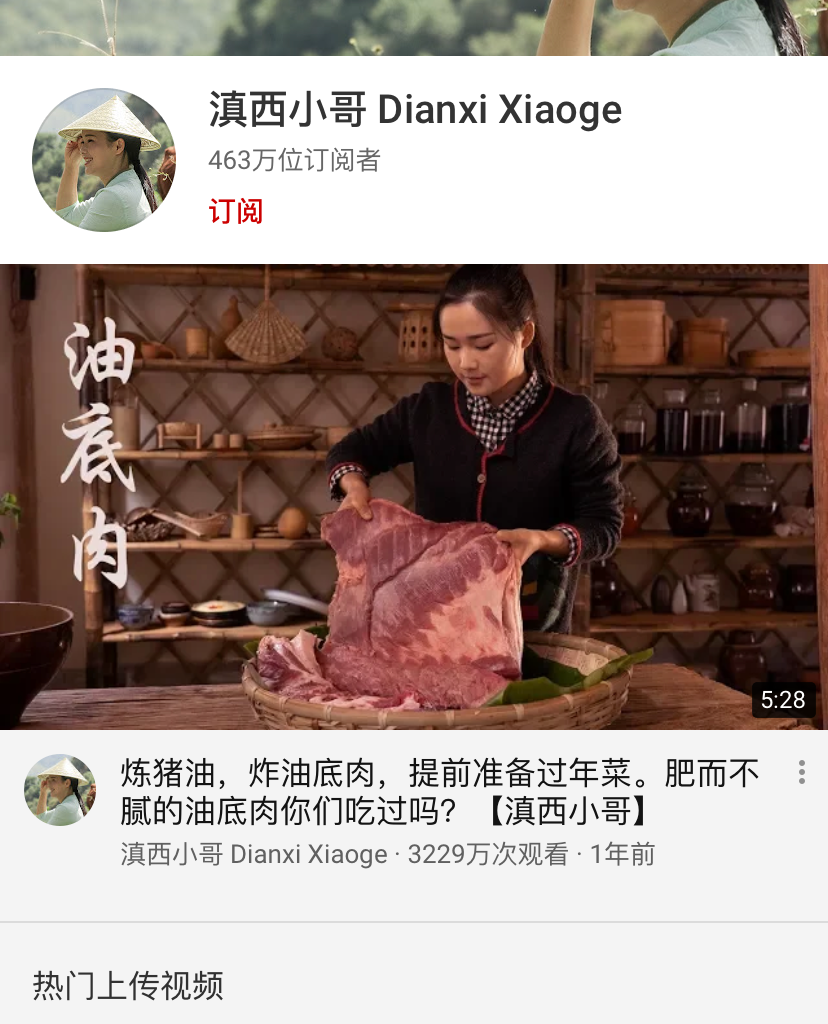 和李子柒一样做田园生活美食类短视频,并且在YouTube上获得广泛关注的还有滇西小哥,她在YouTube上拥有463万订阅者。