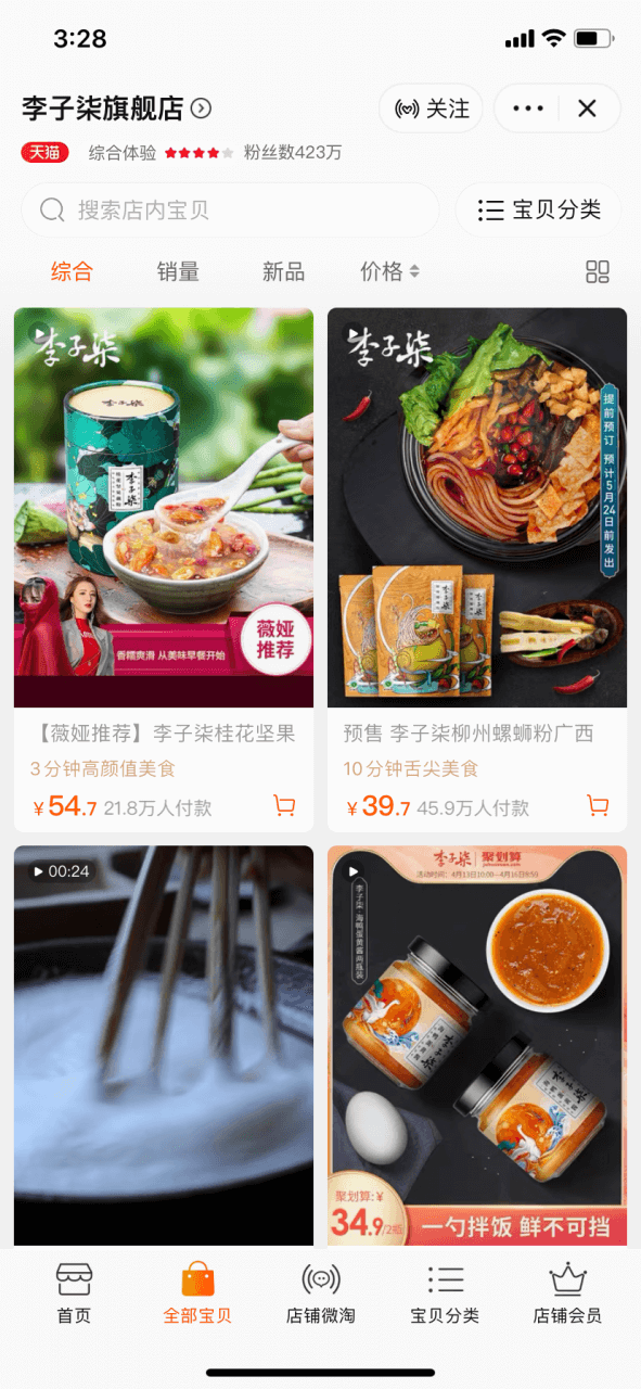 ▲李子柒的天猫旗舰店有423万人关注