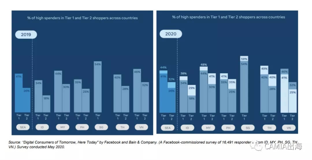 与 2019 年相比,今年增长的主要推动力是整个东南亚的消费能力显着提升。报告中的数据显示,过去 12 个月,一线城市和二线城市之间的消费模式有所缩小。