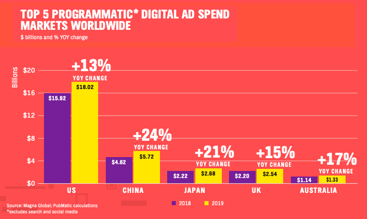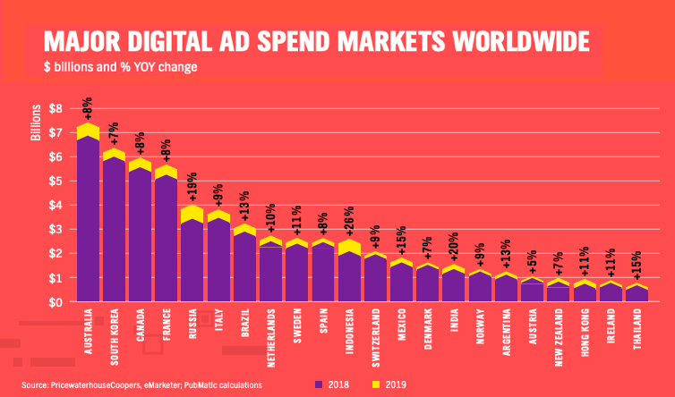 根据PubMatic发布的《 2019年全球数字广告趋势报告》,印度尼西亚是世界上增长最快的数字广告市场,其次是印度。预计2019年数字广告支出将达到26亿美元,比上年增长26%。