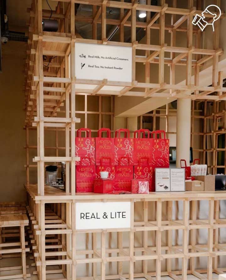 在店铺设计方面,喜茶巴黎观赛茶室汲取了中式原木风格的灵感,构建了一处兼具东方风格与现代设计感的空间。原木元素的运用营造出温馨而自然的氛围,与喜茶所倡导的灵感、高品质和愉悦的品牌特质相得益彰。包装上,喜茶选择了鲜明的正红色作为主色调,这一大胆而醒目的设计在原木风格的背景中脱颖而出。不仅强化了品牌的辨识度,也如同行走的广告,吸引着过往行人的目光。