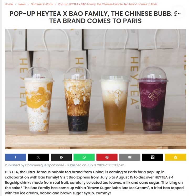 早在喜茶巴黎观赛茶室正式开业前,品牌便与当地知名的新派中餐馆BAO’S FAMILY合作,共同研发了一款仅在BAO’S FAMILY可品尝的黑糖珍珠甜品,为即将到来的快闪活动预热。喜茶还邀请知名法国媒体SORTIR PARIS提前报道这一合作,标题为“中国最火的奶茶店与BAO’S FAMILY联名”,吸引了当法国媒体与公众的广泛关注,法国网友纷纷留言:迫不及待想去品尝这道特别东方甜点。为喜茶快闪店在开业前就积累了大量的品牌曝光。