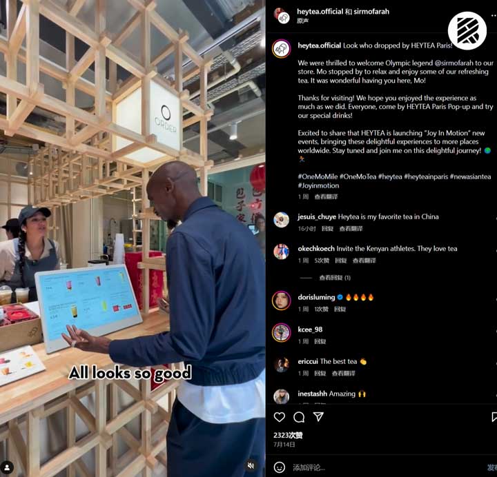 喜茶特别邀请了奥运冠军Simon Farah参与品牌宣传。在宣传视频中,Simon直言喜茶就是他一直寻找的健康、轻负担、美味的东方茶饮。视频中营造了巴黎夏日与喜茶相伴的欢快氛围,展示了喜茶巴黎快闪店如何以灵感之茶带给Simon愉悦的体验。通过这一视频,喜茶不仅传达了品牌的活力与创意,还让观众感受到了夏日巴黎的独特魅力与喜茶带来的快乐时光。截至7月25日,Instagram上,该条视频获得了高达100万次的播放量。
