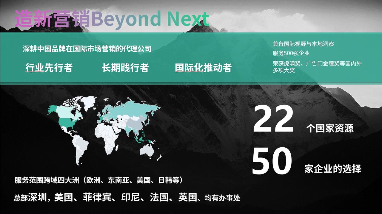 BeyondNext是造新(深圳)营销咨询有限责任公司旗下品牌,是一家专注为中国品牌在国际市场提供全域品牌整合营销的服务机构。擅长跨境市场营销、国际公关策划、海外社媒营销…总部位于深圳,致力于打造全球协作的出海营销生态链,并在法国、美国、菲律宾设有办事处。创立初衷是与全球 32 个国家的合作伙伴共同致力与帮助中国客户与全球目标受众建立联系,以实现有效的海外市场品牌推广。