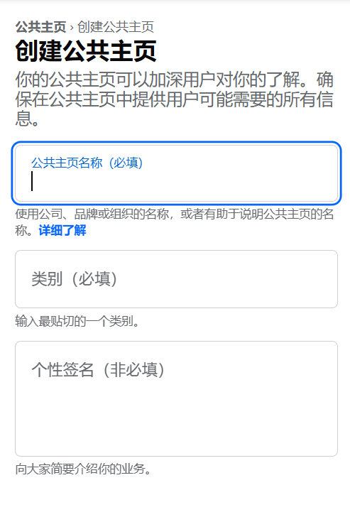 公共主页名称:使用公司、品牌名称,或者可说明公共主页用途的名称。